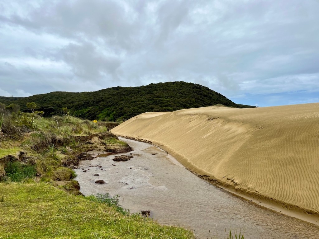 I arrived in Kaitai (most northern town by air) on 11/28/23. Hit the grocery store for my first of many over supplies of food and made my way north. Used a taxi for part way, then hitched. The trail normally starts at the very northern tip, Cape Reinga. However the first 20 km of trail, was closed due to heavy storms unearthing some sacred Mauri graves, so my start was at Te Paki Stream, which meats the Tasman Sea at the Te Paki Sand Dunes. I found this a perfectly lovely start to the hike; surreal, as dunes can be.