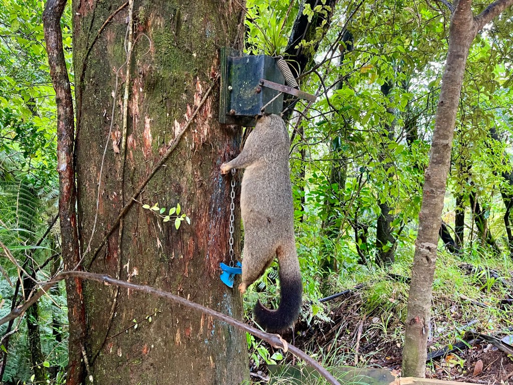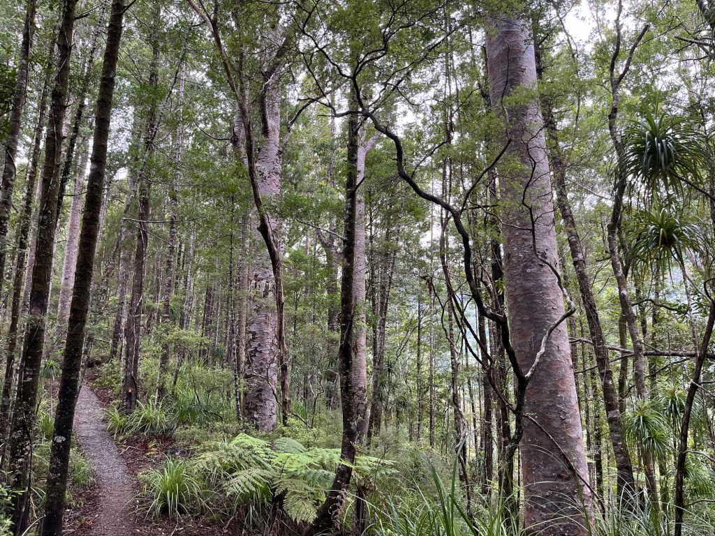 After Ninety Mike Beach, I stayed in Ahipara then road walked/hitched (due to dangerous road) to Kaitai for another resupply (oversupply) and headed to the Raetea and Mangamuka Tracks. I had fretted over both of these tracks, as there were many comments on Far Out (a mobile phone map app that enables hiker comments at water sources, camping spots etc etc) saying that it was incredibly muddy and even ‘dangerous’, and the trail notes warned that the Waipapa River could flash flood etc etc etc. 😬 The Raetea Track was gorgeous though. Muddy, yes. Dangerous, no. The track up Mangapukahukahu Stream to Waipapa River was tame and amazing; one of my favorite parts of the trail. Lucky me! The scrappy (‘dangerous’) trail along the bank to the Pukatea Ridge trail was just challenging enough to be fun (if it had been raining, my assessment might be quite different). Just as I hit the Pukatea Ridge Trail, the sky opened up to a torrential rain! The ridge was home to a Kauri preserve, and was full of large specimens of this giant tree. Some tracks in Kauri forests are closed to hiking due to Kauri die back, an incurable fungal disease that may be indirectly due to the profound decline of birds in NZ (due to invasive Australian possums, stoats (weasel), rats and hedgehogs. Widespread poisoning and trapping is seen along trails, as NZ tries to beat back invasive species in hopes of regaining its native bird populations.